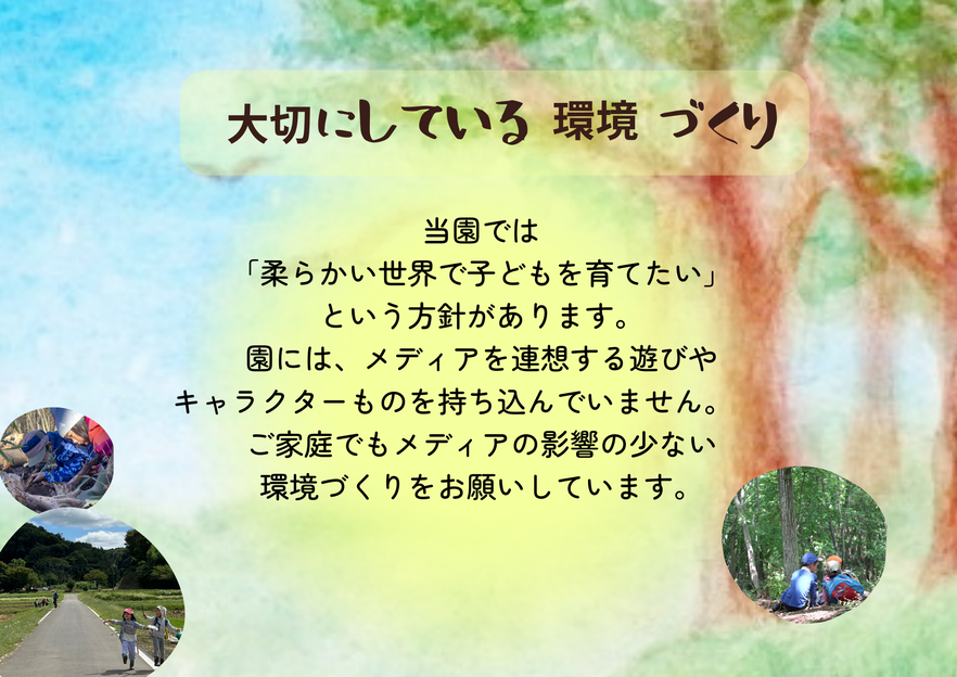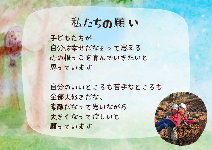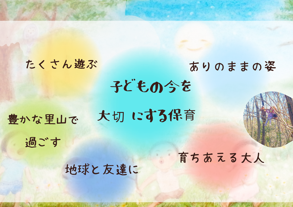 私たちは、子どもたちの”今”の姿を感じ、心根に寄り添い、大らかに見守りながら自分らしく子どもと育ちあっていく事を大切にしています。