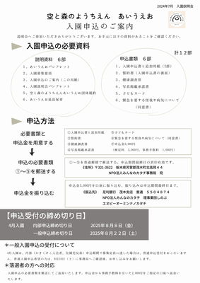 | 森のようちえん(週4日/幼児) 子どもの居場所(週2日/小学生)※フリースクール 青空親子クラス(週1/親子) |